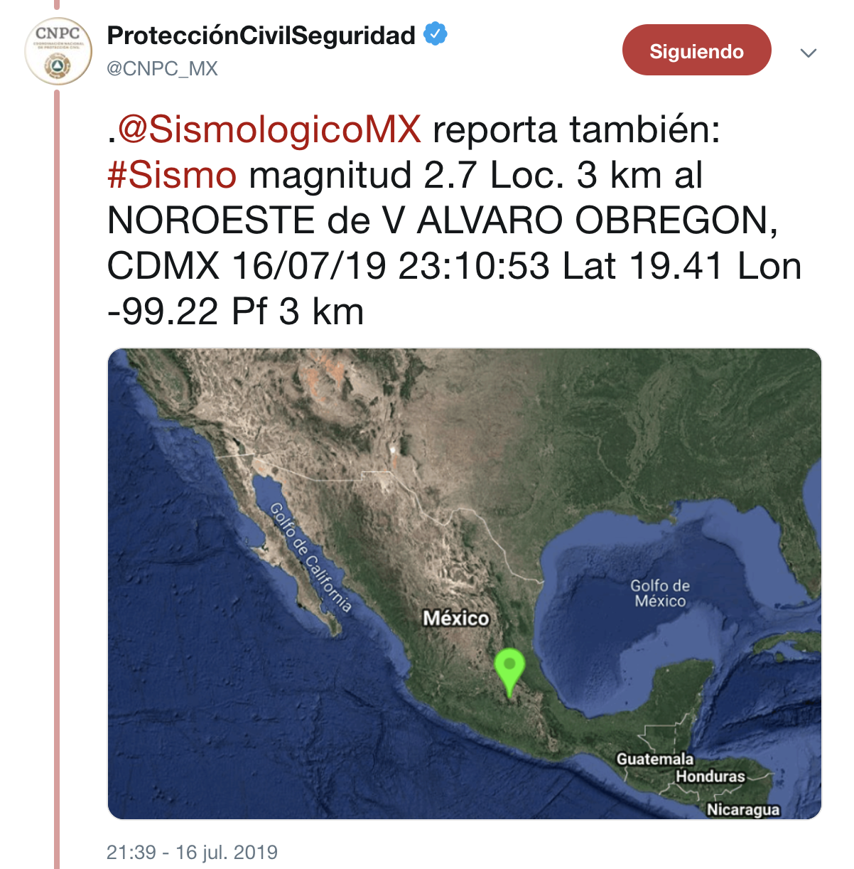 Finalmente, un tercer sismo se registró la noche de este martes a las 23:18 h al noroeste de Álvaro Obregón en la Ciudad de México. El Sismológico Nacional indicó que la magnitud fue de 2.7, a 3 kilómetros.