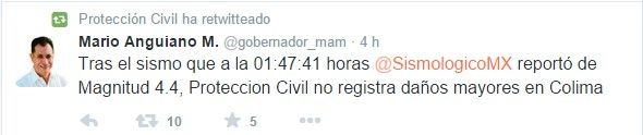 Sin afectaciones en Colima tras sismo de esta madrugada - tuit-pc