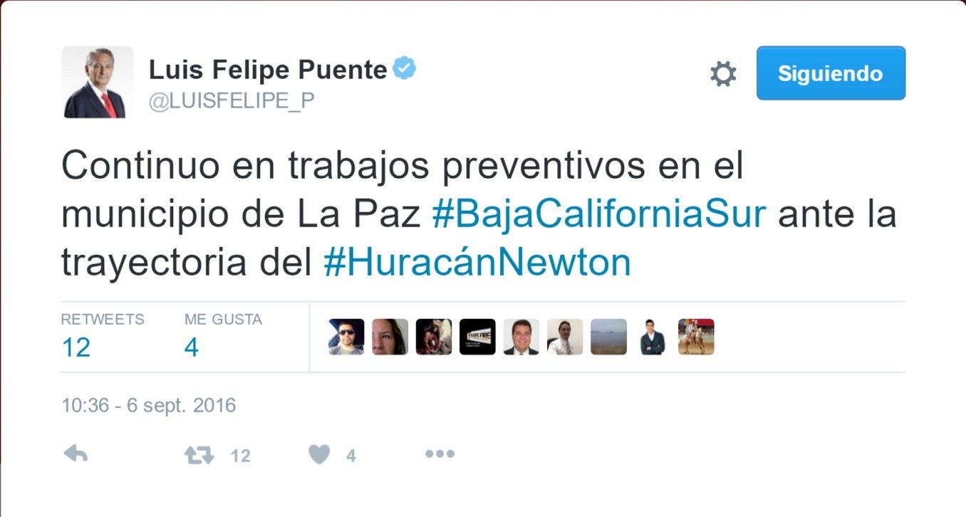 “Al momento no se tiene reporte de personas fallecidas o desaparecidas por el paso del #Huracán #Newton”, “Continuo en trabajos preventivos en el municipio de La Paz #BajaCaliforniaSur ante la trayectoria del #HuracánNewton”, escribió en su cuenta de Twitter @LUISFELIPE_P.