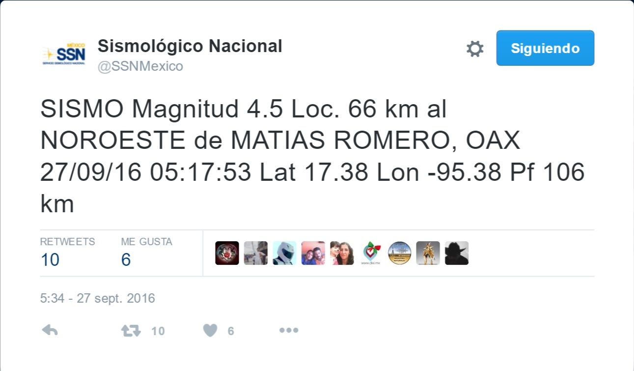 El Servicio Sismológico Nacional (SSN) informó que a las 5:17 h de este martes ocurrió un sismo magnitud 4.5 en la escala de Richter, con epicentro a 66 kilómetros al noroeste de Matías Romero, Oaxaca.