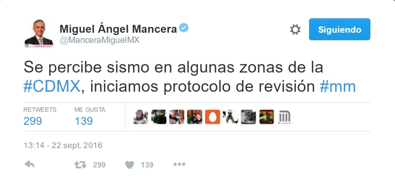 Por su parte, el jefe de gobierno capitalino, Miguel Ángel Mancera, también se pronunció en redes sociales sobre el movimiento telúrico.