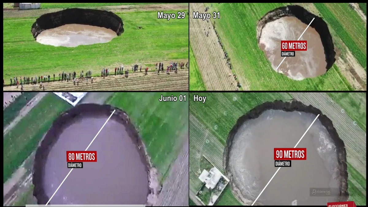De los cinco metros su diámetro ha crecido hasta alcanzar casi los 100 metros, en tanto que se presume que su profundidad es de entre 15 y 20 metros.