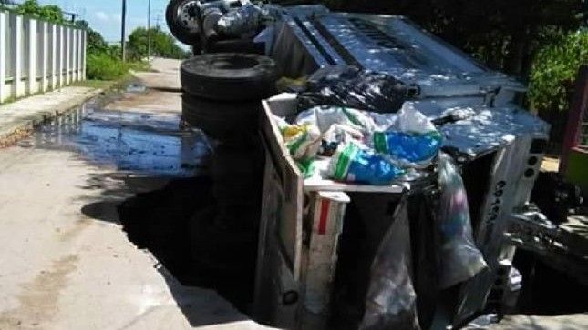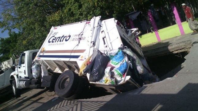 Ayer lunes un camión recolector de basura que circulaba por la calle de Mario Trujillo García, en la colonia Tamulté de las Sabanas en Tabasco, súbitamente se ladeo debido a que el pavimento se abrió dando lugar a un socavón que tragó a la llanta trasera de la pesada unidad.