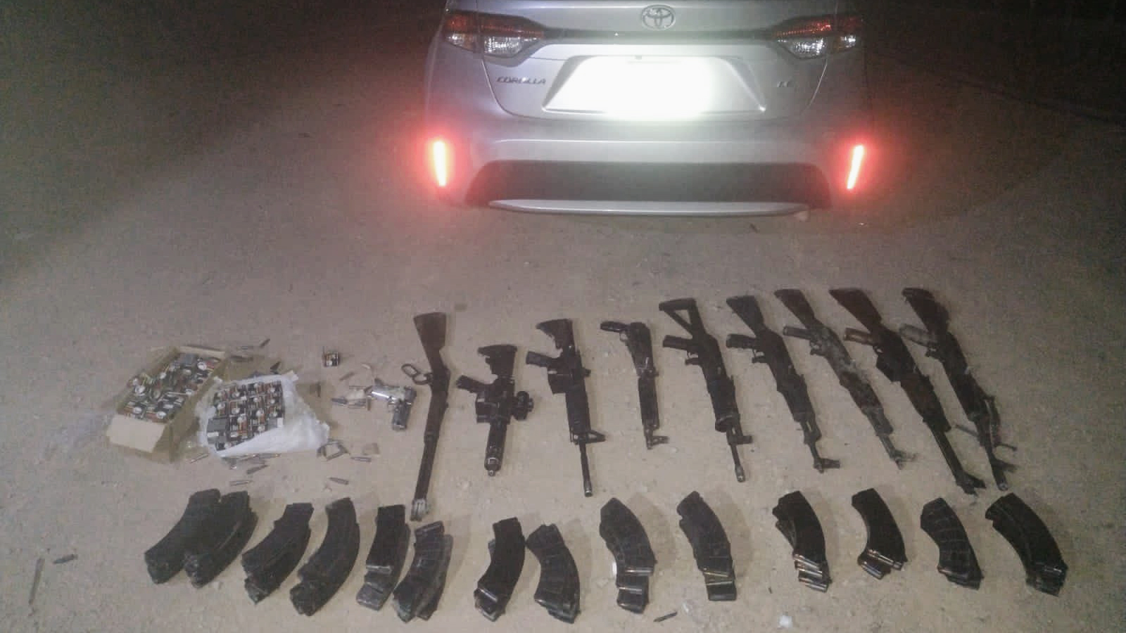 Auto y armas aseguradas en Caborca tras enfrentamiento. Foto de @MesaSegSonora