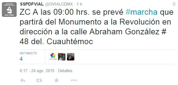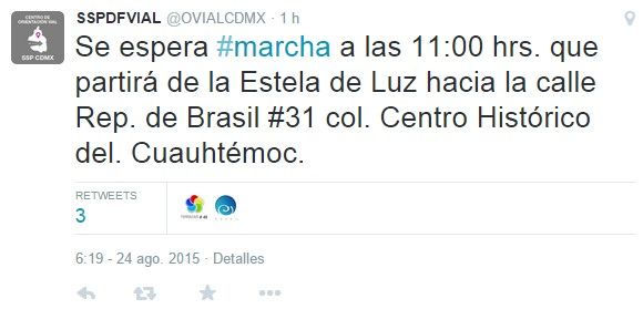 En su cuenta @OVIALCDMX de Twitter, la secretaría también dio a conocer: “A las 11:00 hrs. considere concentración-marcha de la Estela de Luz hacia República de Brasil #31, Col. Centro, Del. Cuauhtémoc”.
