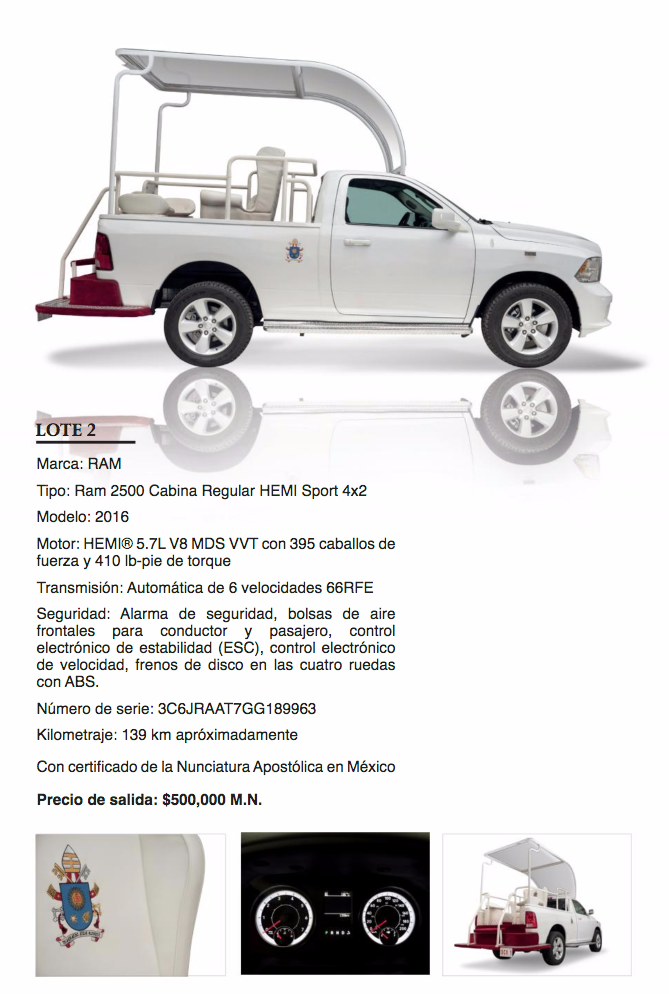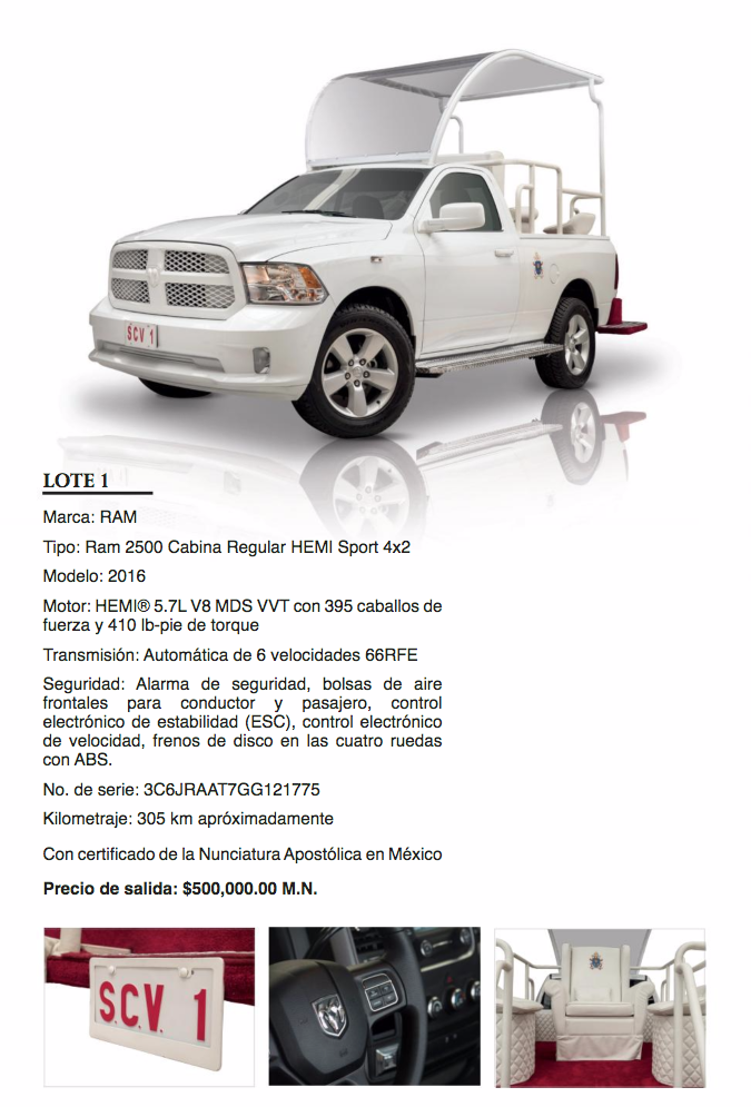 El precio de salida de ambos vehículos, que cuentan con certificado de la Nunciatura Apostólica en México, es de 500 mil pesos.