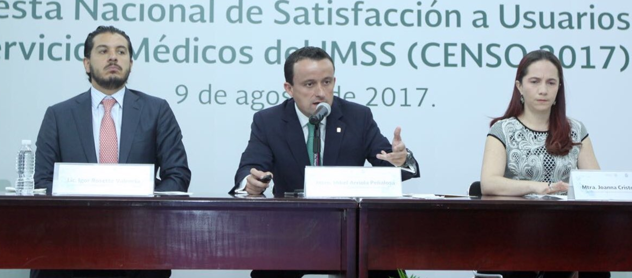 Al dar a conocer los resultados de la Encuesta Nacional de Satisfacción a Usuarios de Servicios Médicos Censo 2017 (Ensat 2017), el director general del Instituto Mexicano del Seguro Social (IMSS), Mikel Arriola Peñalosa, destacó que entre 2016 y este año se dio un incremento en dos puntos porcentuales en las acciones para el fortalecimiento de las atención médica, lo que significa que hay un 83 por ciento de derechohabientes muy satisfechos o satisfechos con los servicios que prestan las unidades.