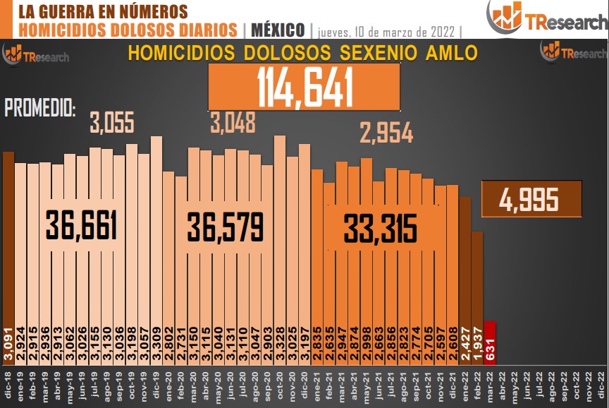 El reporte ‘MX: La Guerra en Números’, de T-ResearchMX, detalla que, de acuerdo con el registro de homicidios dolosos de la Secretaría de Seguridad y Protección Ciudadana, del 1 de diciembre de 2018 al 9 de marzo de 2022, tiempo que lleva la actual Administración del presidente Andrés Manuel López Obrador, las fiscalías estatales y federales han registrado 114 mil 641 homicidios dolosos en México.