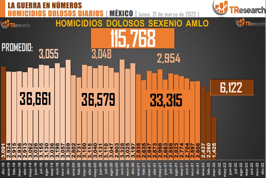 El reporte ‘MX: La Guerra en Números’, de T-ResearchMX, detalla que, de acuerdo con el registro de homicidios dolosos de la Secretaría de Seguridad y Protección Ciudadana, del 1 de diciembre de 2018 al 20 de marzo de 2022, tiempo que lleva la actual Administración del presidente Andrés Manuel López Obrador, las fiscalías estatales y federales han registrado 115 mil 768 homicidios dolosos en México.
