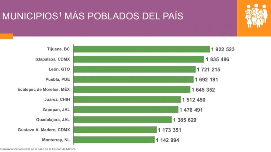 En segundo lugar se encuentra la alcaldía Iztapalapa de la Ciudad de México con 1.8 millones de residentes; seguida de León, Guanajuato con 1.7 millones y Puebla, Puebla con 1.6 millones.