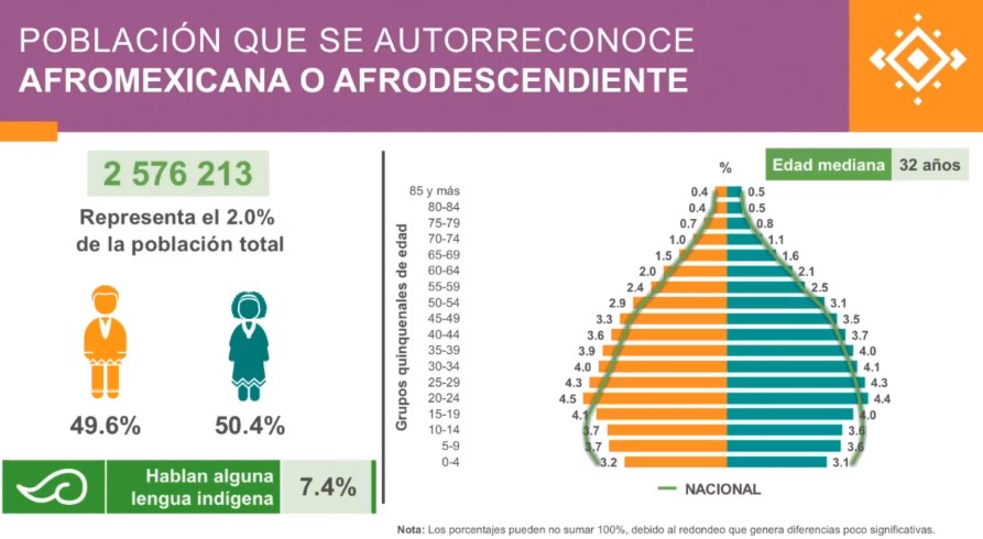 Por primera vez también se midió la cantidad de población que se autorreconoce como afromexicana o afrodescendiente, llegando al 2 por ciento de la población total.