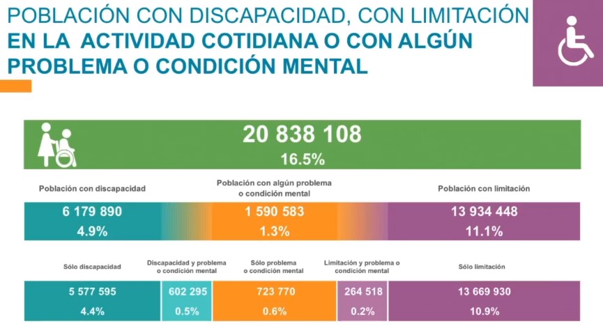 En cuanto a discapacidades o limitaciones, en 2020 se registraron 6.17 millones de personas con alguna discapacidad, 1.59 millones con algún problema o condición mental y 13.93 millones con alguna limitación.