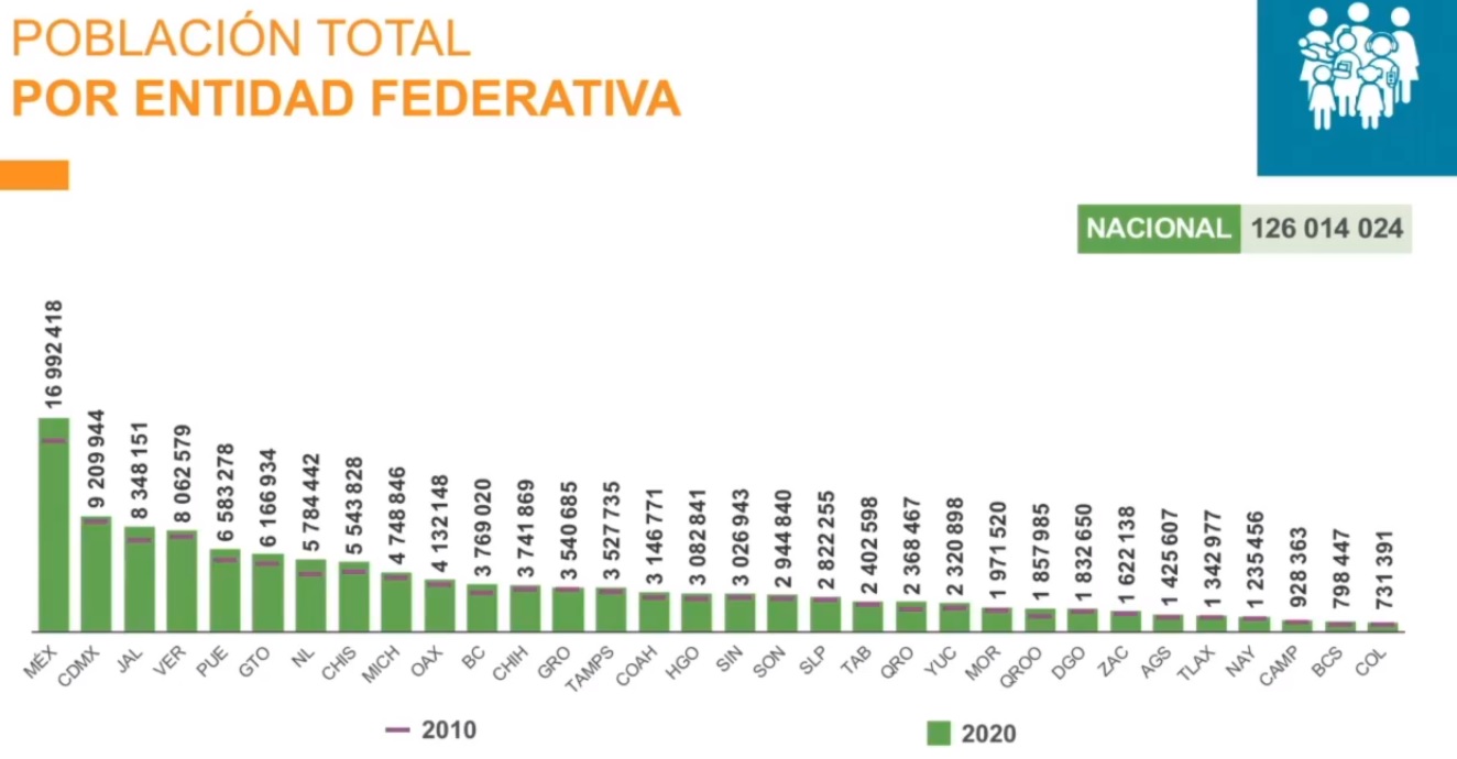 México alberga 126 millones 14 mil 24 habitantes, de acuerdo con el Censo de Población y Vivienda que aplicó el Instituto Nacional de Estadística y Geografía (Inegi) a inicios de 2020.