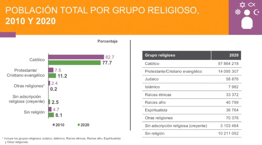 Por grupo religioso, disminuyó el porcentaje de población católica al albergar 97 millones 864 mil 218 personas.