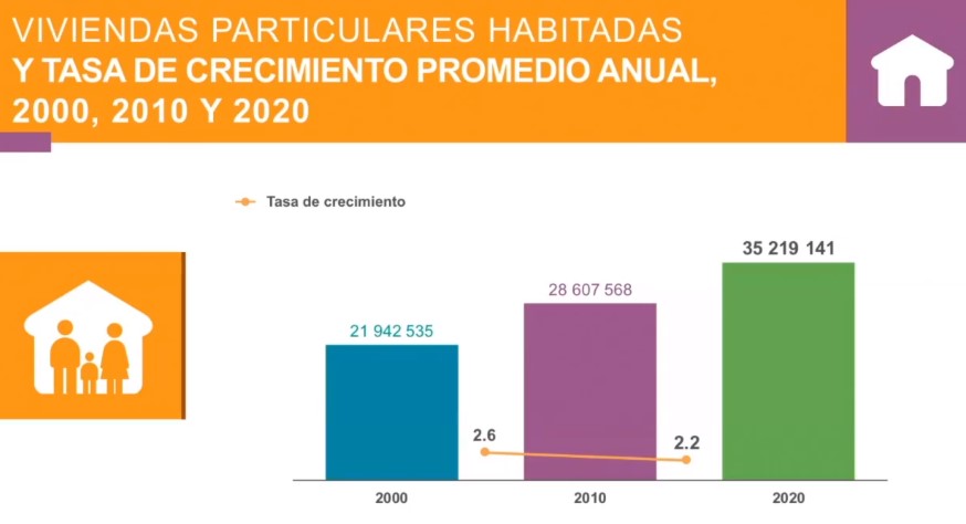 En 2020 en México se registró que hay 35 millones 219 mil 141 viviendas particulares habitadas, que son habitadas en promedio por 3.6 personas cada una.