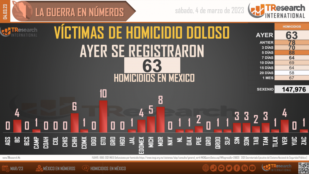 El reporte ‘MX: La Guerra en Números’, de T-ResearchMX, detalla que, de acuerdo con el registro de homicidios dolosos de la Secretaría de Seguridad y Protección Ciudadana, del 1 de diciembre de 2018 al 4 de marzo de 2023, tiempo que lleva la Administración del presidente Andrés Manuel López Obrador, las fiscalías estatales y federales han registrado 147 mil 976 homicidios dolosos en México.