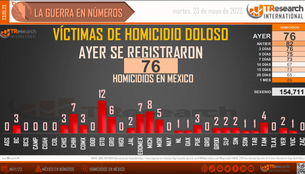 El reporte ‘MX: La Guerra en Números’, de T-ResearchMX, detalla que, de acuerdo con el registro de homicidios dolosos de la Secretaría de Seguridad y Protección Ciudadana, del 1 de diciembre de 2018 al 22 de mayo de 2023, tiempo que lleva la Administración del presidente Andrés Manuel López Obrador, las fiscalías estatales y federales han registrado 154 mil 711 homicidios dolosos en México.