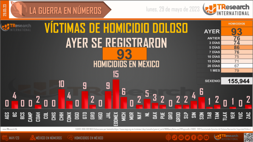 El reporte ‘MX: La Guerra en Números’, de T-ResearchMX, detalla que, de acuerdo con el registro de homicidios dolosos de la Secretaría de Seguridad y Protección Ciudadana, del 1 de diciembre de 2018 al 27 de mayo de 2023, tiempo que lleva la Administración del presidente Andrés Manuel López Obrador, las fiscalías estatales y federales han registrado 155 mil 27 homicidios dolosos en México.