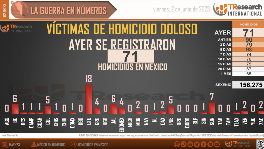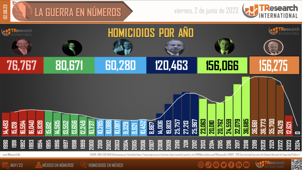 El reporte ‘MX: La Guerra en Números’, de T-ResearchMX, detalla que, de acuerdo con el registro de homicidios dolosos de la Secretaría de Seguridad y Protección Ciudadana, del 1 de diciembre de 2018 al 1 de junio de 2023, tiempo que lleva la Administración del presidente Andrés Manuel López Obrador, las fiscalías estatales y federales han registrado 156 mil 275 homicidios dolosos en México.