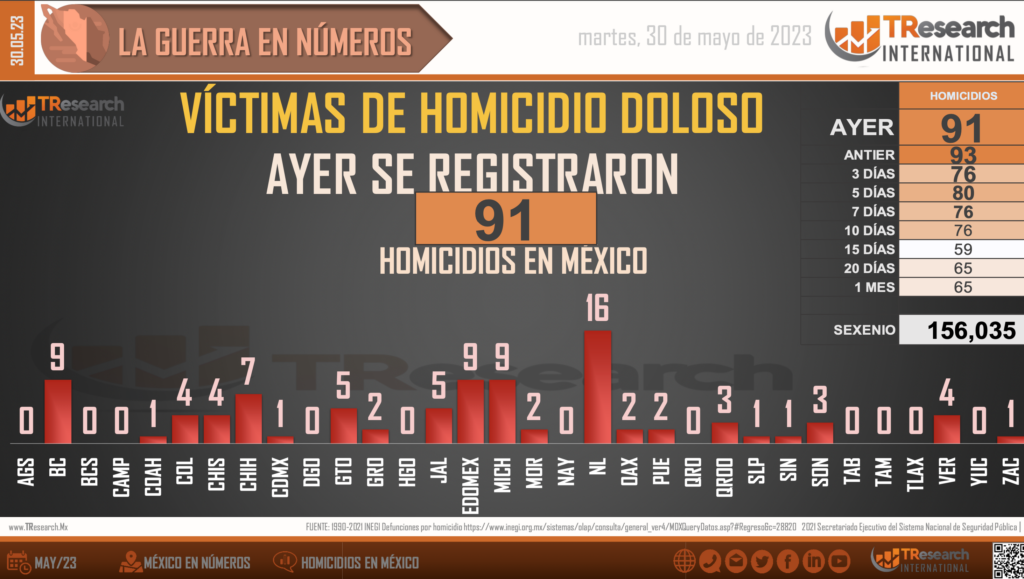 El reporte ‘MX: La Guerra en Números’, de T-ResearchMX, detalla que, de acuerdo con el registro de homicidios dolosos de la Secretaría de Seguridad y Protección Ciudadana, del 1 de diciembre de 2018 al 29 de mayo de 2023, tiempo que lleva la Administración del presidente Andrés Manuel López Obrador, las fiscalías estatales y federales han registrado 156 mil 35 homicidios dolosos en México.