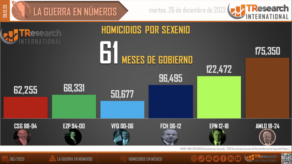 El reporte ‘MX: La Guerra en Números’, de  T-ResearchMX, detalla que, de acuerdo con el registro de homicidios dolosos de la Secretaría de Seguridad y Protección Ciudadana, del 1 de diciembre de 2018 al 26 de diciembre de 2023, tiempo que lleva la Administración del presidente Andrés Manuel López Obrador, las fiscalías estatales y federales han registrado 175 mil 350 homicidios dolosos en México.