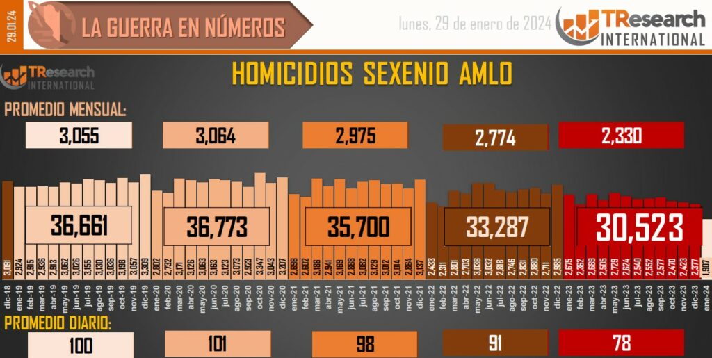 El reporte ‘MX: La Guerra en Números’, de T-ResearchMX, detalla que, de acuerdo con el registro de homicidios dolosos de la Secretaría de Seguridad y Protección Ciudadana, del 1 de diciembre de 2018 al 28 de enero de 2024, tiempo que lleva la Administración del presidente Andrés Manuel López Obrador, las fiscalías estatales y federales han registrado 177 mil 942 homicidios dolosos en México.