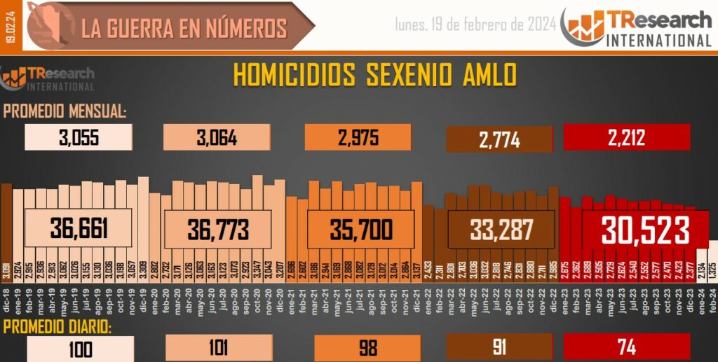 El reporte ‘MX: La Guerra en Números’, de T-ResearchMX, detalla que, de acuerdo con el registro de homicidios dolosos de la Secretaría de Seguridad y Protección Ciudadana, del 1 de diciembre de 2018 al 18 de febrero de 2024, tiempo que lleva la Administración del presidente Andrés Manuel López Obrador, las fiscalías estatales y federales han registrado 179 mil 494 homicidios dolosos en México.