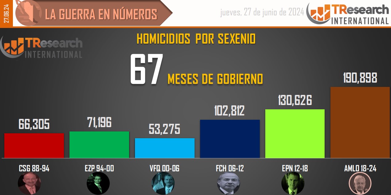 El reporte ‘MX: La Guerra en Números’, de T-ResearchMX, detalla que, de acuerdo con el registro de homicidios dolosos de la Secretaría de Seguridad y Protección Ciudadana, del 1 de diciembre de 2018 al 26 de junio de 2024, tiempo que lleva la Administración del presidente Andrés Manuel López Obrador, las fiscalías estatales y federales han registrado 190 mil 898 homicidios dolosos en México.