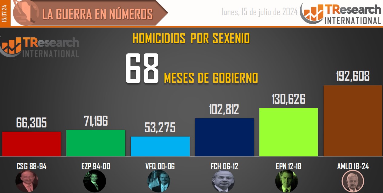 El reporte ‘MX: La Guerra en Números’, de T-ResearchMX, detalla que, de acuerdo con el registro de homicidios dolosos de la Secretaría de Seguridad y Protección Ciudadana, del 1 de diciembre de 2018 al 14 de julio de 2024, tiempo que lleva la Administración del presidente Andrés Manuel López Obrador, las fiscalías estatales y federales han registrado 192 mil 608 homicidios dolosos en México.