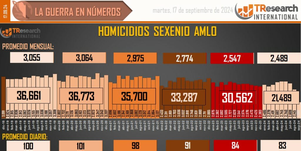 El reporte ‘MX: La Guerra en Números’, de T-ResearchMX, detalla que, de acuerdo con el registro de homicidios dolosos de la Secretaría de Seguridad y Protección Ciudadana, del 1 de diciembre de 2018 al 16 de septiembre de 2024, tiempo que lleva la Administración del presidente Andrés Manuel López Obrador, las fiscalías estatales y federales han registrado 197 mil 563 homicidios dolosos en México.