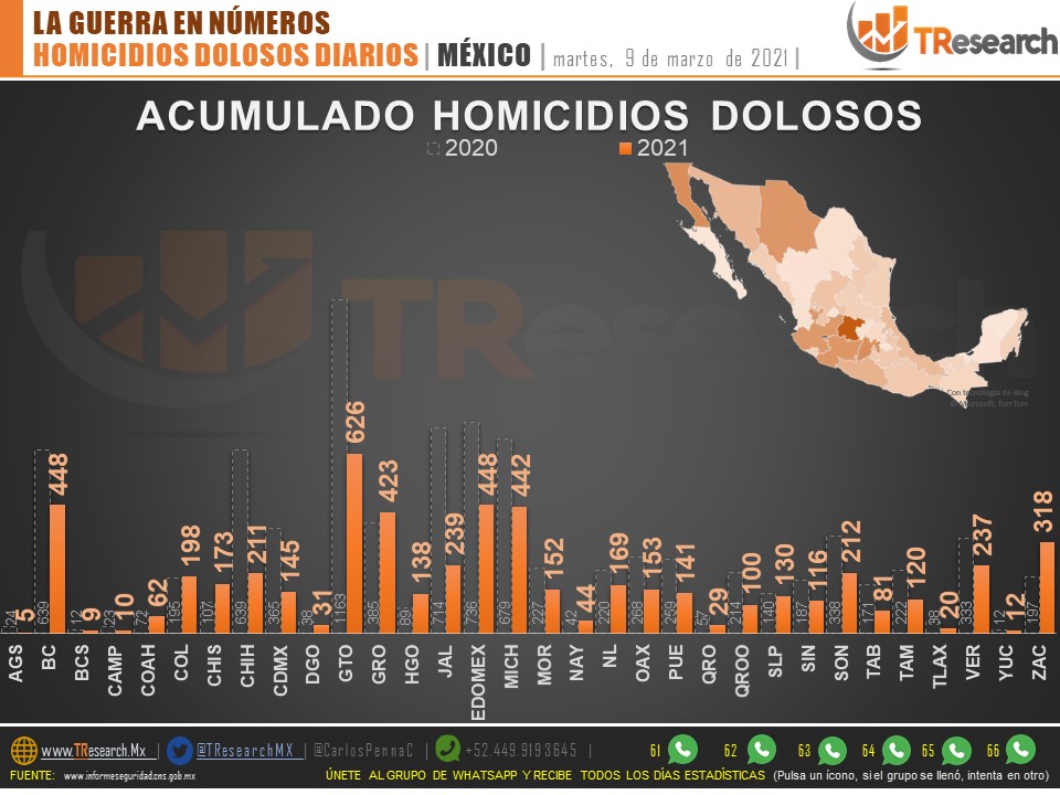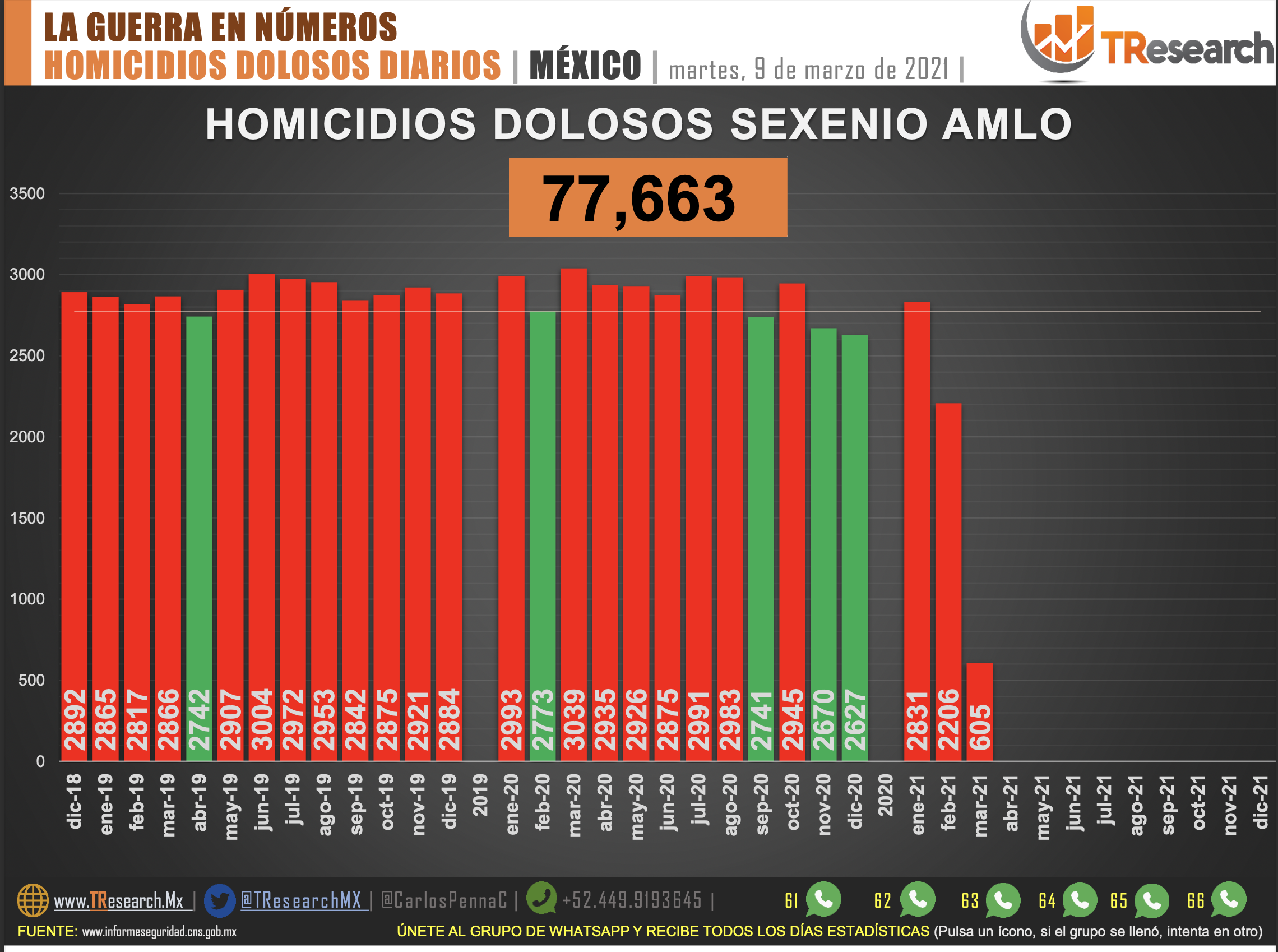 El reporte ‘MX: La Guerra en Números’, de T-ResearchMX, detalla que, de acuerdo con el registro de homicidios dolosos de la Secretaría de Seguridad y Protección Ciudadana del Gobierno de Méxicoo, del 1 de diciembre de 2018 al 4 de marzo de 2021, tiempo que lleva la actual Administración del presidente Andrés Manuel López Obrador, las fiscalías estatales y federales han registrado 77 mil 663 homicidios dolosos en México.