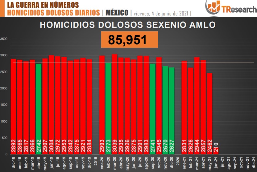 El reporte ‘MX: La Guerra en Números’, de T-ResearchMX, detalla que, de acuerdo con el registro de homicidios dolosos de la Secretaría de Seguridad y Protección Ciudadana, del 1 de diciembre de 2018 al 3 de junio de 2021, tiempo que lleva la actual Administración del presidente Andrés Manuel López Obrador, las fiscalías estatales y federales han registrado 85 mil 951 homicidios dolosos en México.