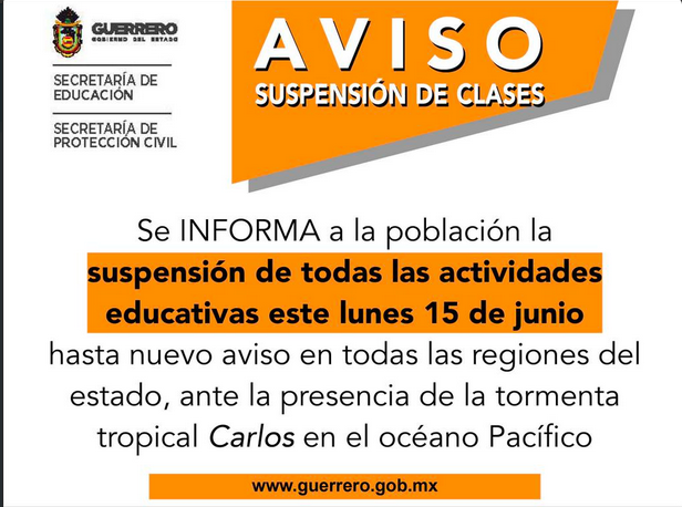 En su perfil oficial de Twitter, la dependencia estatal publicó que se suspenderán las clases este lunes por la presencia de la tormenta tropical Carlos en el Pacífico, debido a los efectos que provoca en el estado.