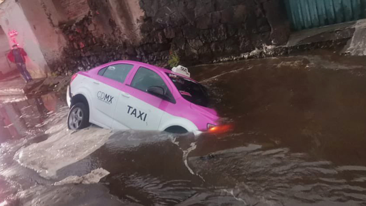 La ruptura de una tubería abrió un enorme socavón en calles de la alcaldía Milpa Alta de la Ciudad de México, hoyo en el que cayó un taxi.