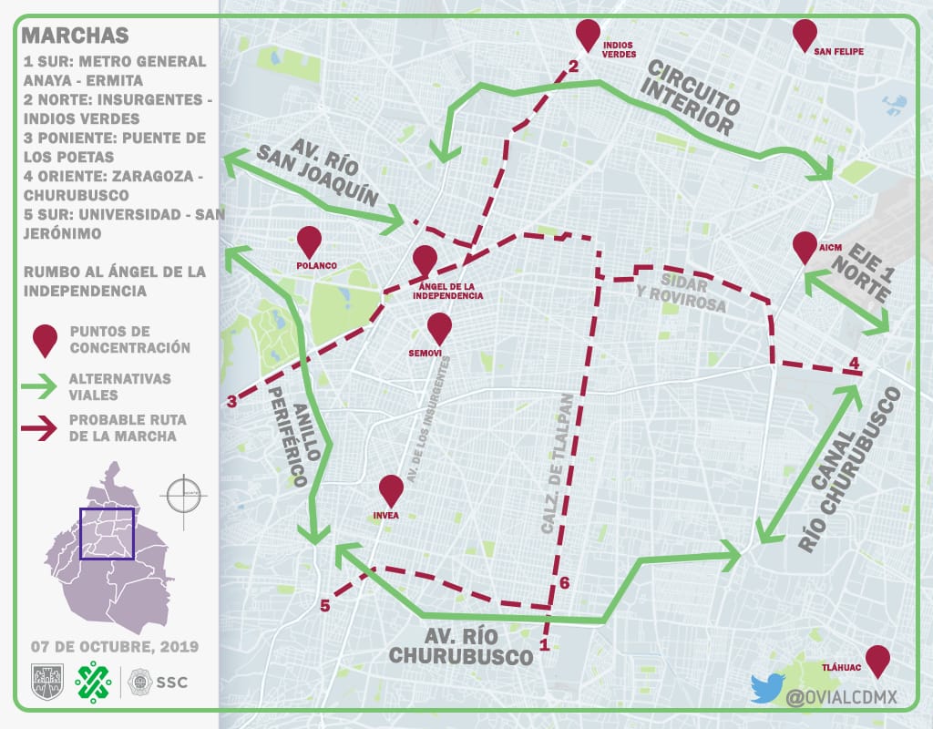 Serán desplegados los policías de la SSC en la zona Centro de la capital, donde las vialidades que se verán afectadas serán las avenidas Paseo de la Reforma, Insurgentes y Viaducto, así como en los puntos de afectación como Indios Verdes, Periférico, Polanco, Santa Fe, Zaragoza, Tláhuac, Iztapalapa, entre otras vialidades de acceso a la ciudad.