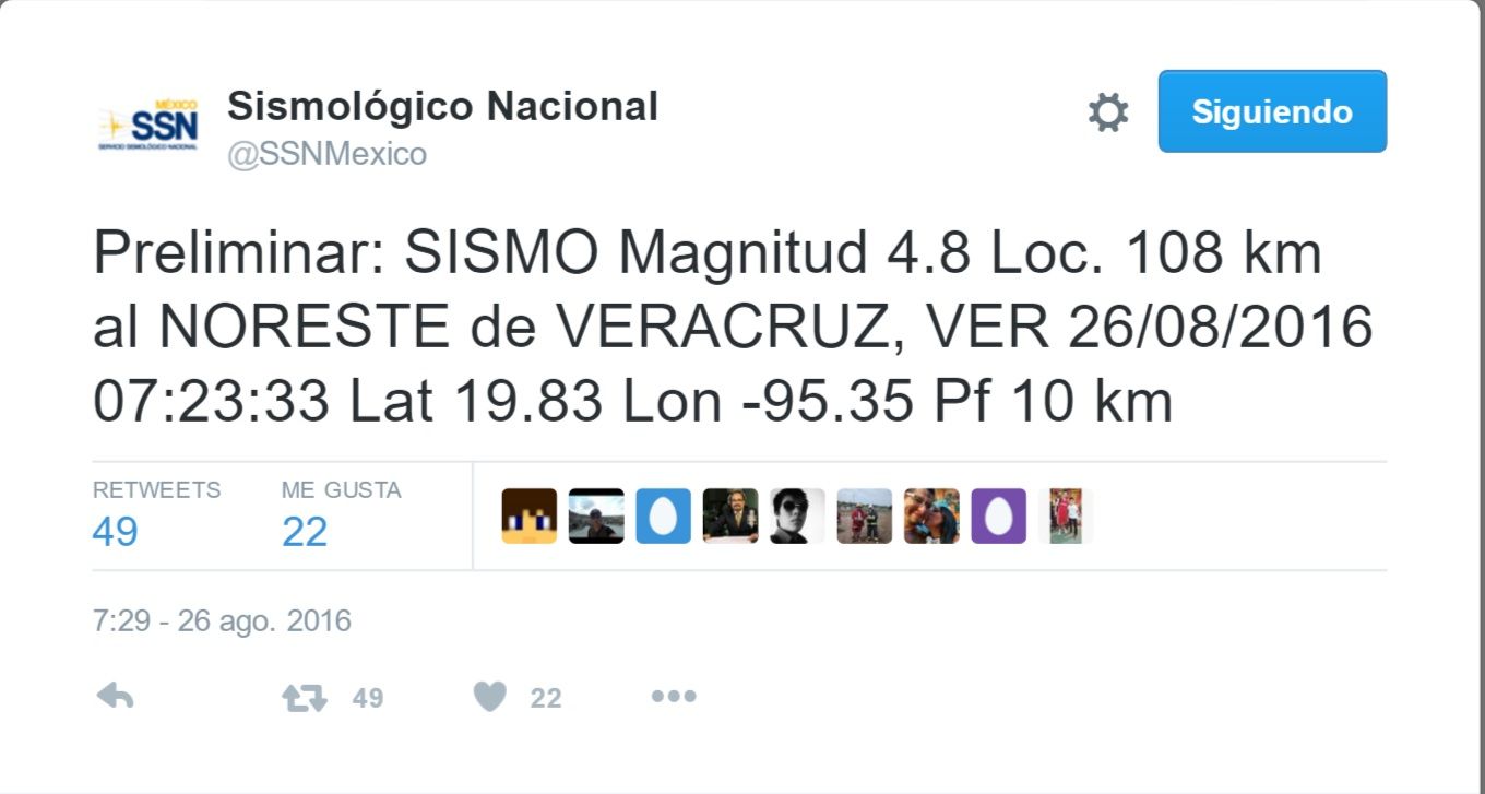 A las 7:23 h ocurrió al noreste de Veracrcuz un sismo de magnitud preliminar 4.8, el cual, a decir de usuarios de redes sociales, fue perceptible levemente.
