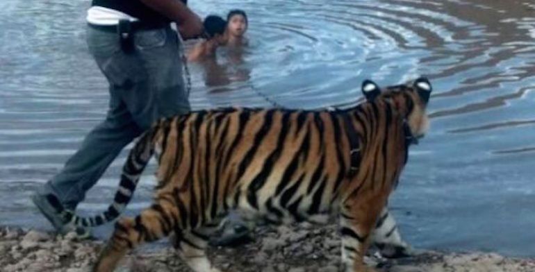 Un hombre se encontraba paseando a su tigre en Chihuahua, cuando al meterse al río Sacramento, el felino se soltó de su arnés, asustando a varias personas que se encontraban en el lugar.