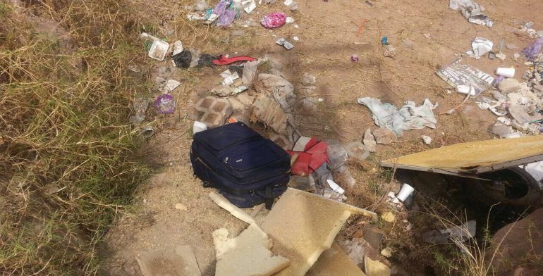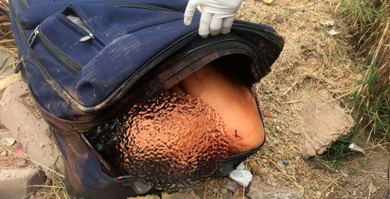 Antes de las 16:00 horas, de este sábado la policía municipal recibió el reporte de que en un predio se encontraba abandonada una maleta de color azul en medio de desechos, la cual emanaba líquido hemático.