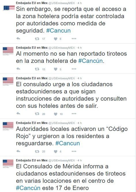 A través de un comunicado, el Consulado General de los Estados Unidos en Mérida informó a los ciudadanos estadounidenses de intercambios de disparos en varios lugares del centro de Cancún el 17 de enero de 2017.