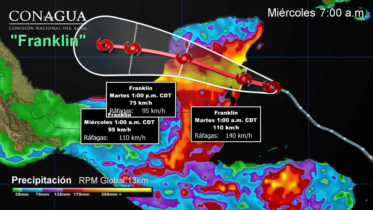 Para las próximas horas se prevén tormentas de intensas a torrenciales en Yucatán, Quintana Roo y Campeche, oleaje elevado de 3 a 5 metros y rachas de viento fuerte superiores a 70 km/h, condiciones originadas por la cercanía de la Tormenta Tropical Franklin, informó el Servicio Meteorológico Nacional (SMN), dependiente de la Comisión Nacional del Agua (Conagua).
