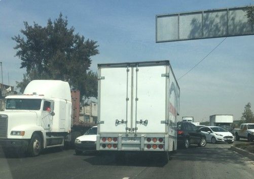En Periférico Oriente más de 200 operadores de cargueros que trabajan en las obras del Nuevo Aeropuerto Internacional de la Ciudad de México realizan un bloqueo con sus unidades de carga para presionar a las autoridades por incumplimiento en sus pagos.