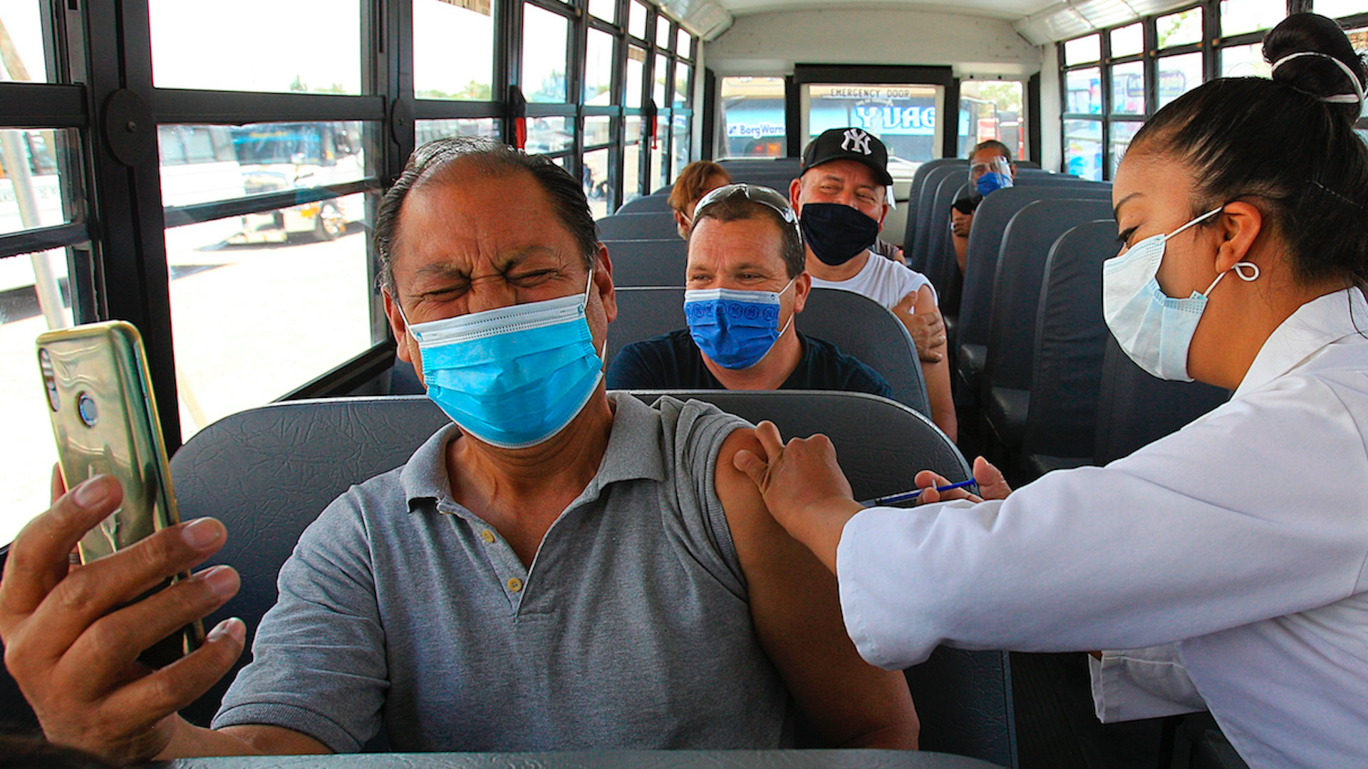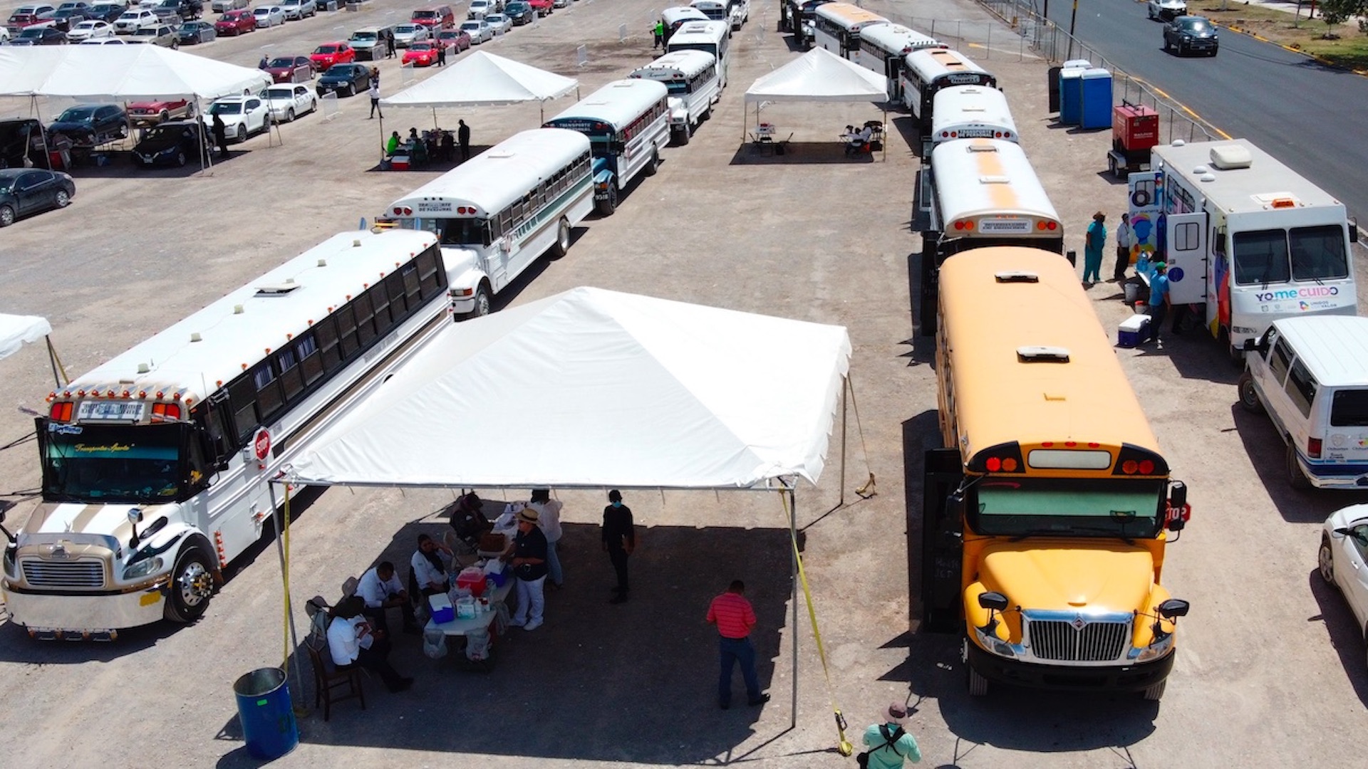 Miles de trabajadores, entre los 50 y 59 años, quienes laboran en las maquiladoras ubicadas en Ciudad Juárez, Chihuahua, frontera con Estados Unidos, son trasladados en autobuses, desde sus centros de trabajo hasta los puntos de vacunación contra el COVID-19 de la ciudad, donde son inoculados sin bajar de los vehículos.