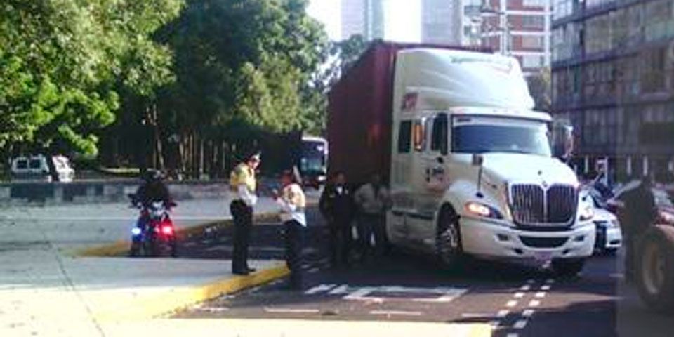 El tráiler de doble caja quedó atorado en el carril derecho de la vialidad, a la altura de Lieja, lo que provocó que la circulación con dirección a Constituyentes estuviera completamente parada por poco menos de una hora.