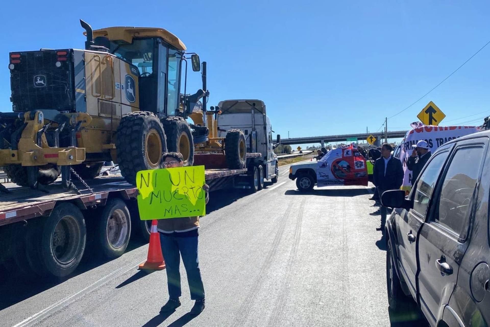 Transportistas de carga, de personal y taxistas de diversas organizaciones en Chihuahua en la zona de la Puerta, en la carrterea que va de Delicias a la capital del estado, donde por el momento no han tomado ningún carril.