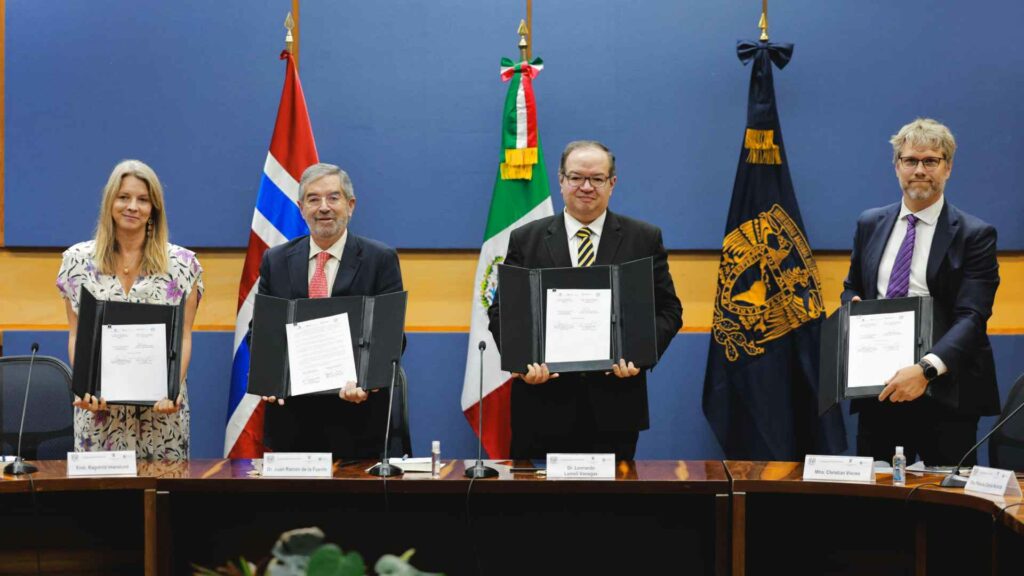 El documento fue suscrito también por Juan José Bremer, director general del Instituto Matías Romero; la embajadora de Noruega, Ragnhild Imerslund; Patricia Dávila, secretaria general de la UNAM; y Christian Visnes, jefe del Programa Global de NOREF.