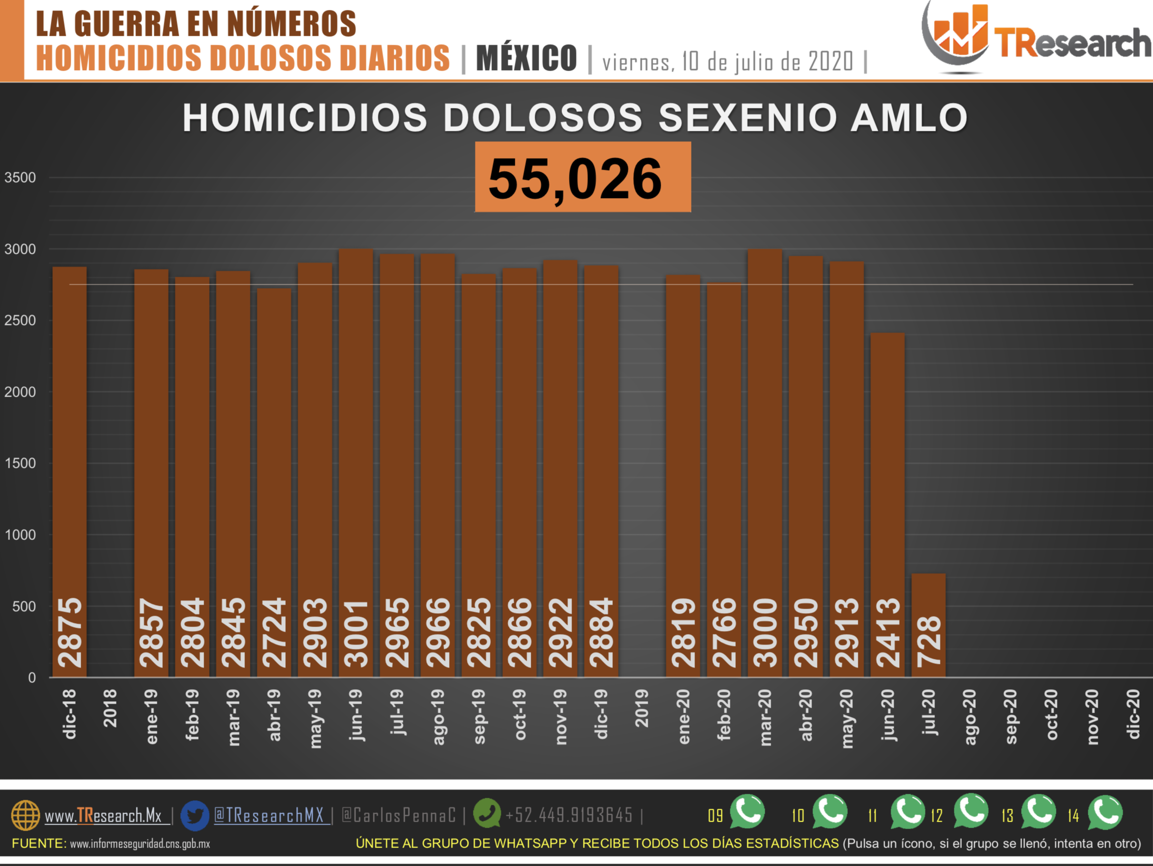 De acuerdo con el registro de homicidios dolosos de la Secretaría de Seguridad y Protección Ciudadana, del 1 de diciembre de 2018 al 9 de julio de 2020, tiempo que lleva la actual Administración del presidente Andrés Manuel López Obrador, las fiscalías estatales y federales han registrado 55 mill 26 homicidios dolosos en México.