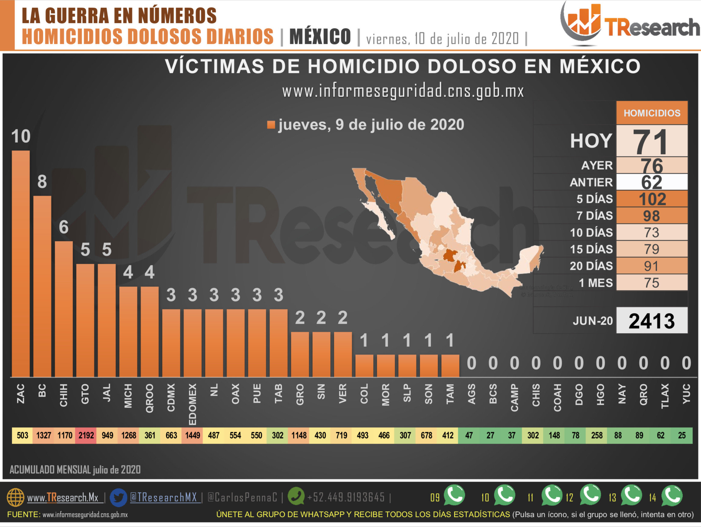 De acuerdo con el reporte diario de homicidios dolosos en el país, el día de ayer 9 de julio México registró 71 homicidios dolosos, cinco menos que los reportados antier 8 de julio.