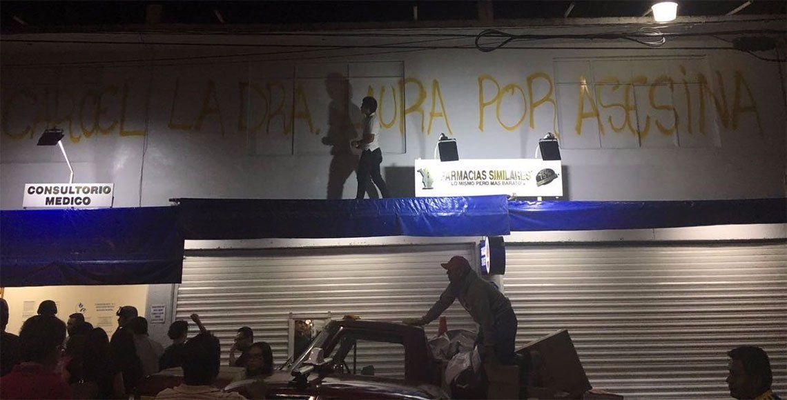 Familiares y vecinos de una mujer que murió en un consultorio médico de Farmacias Similares vandalizaron el lugar acusando que fue por una negligencia médica.