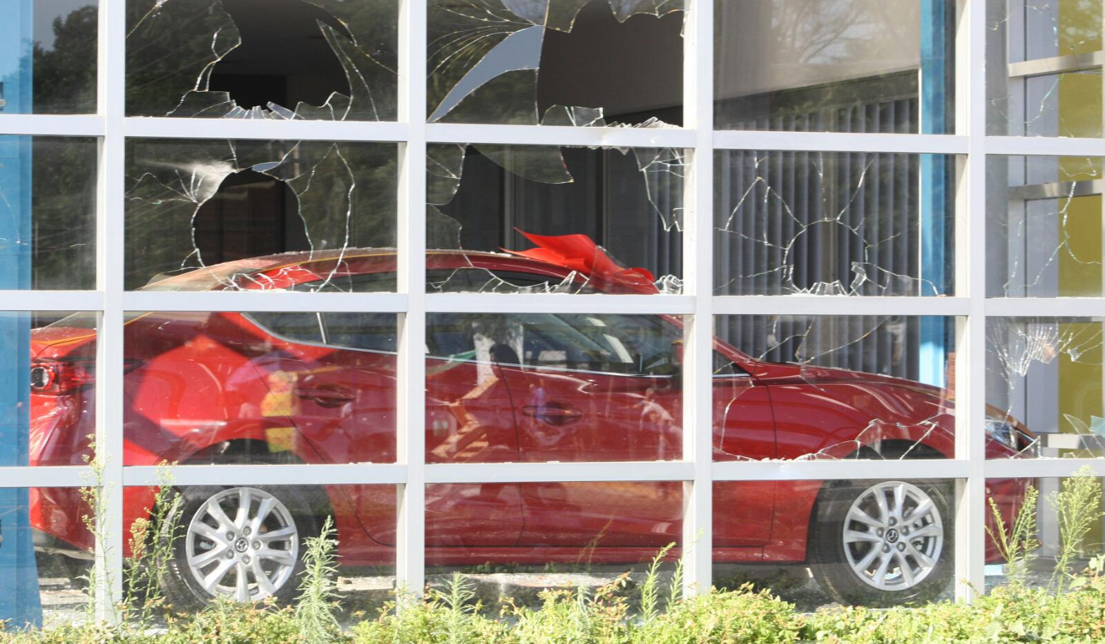 Más adelante, en una agencia de vehículos, rompieron los cristales de las oficinas así como parabrisas de los vehículos en exhibición.