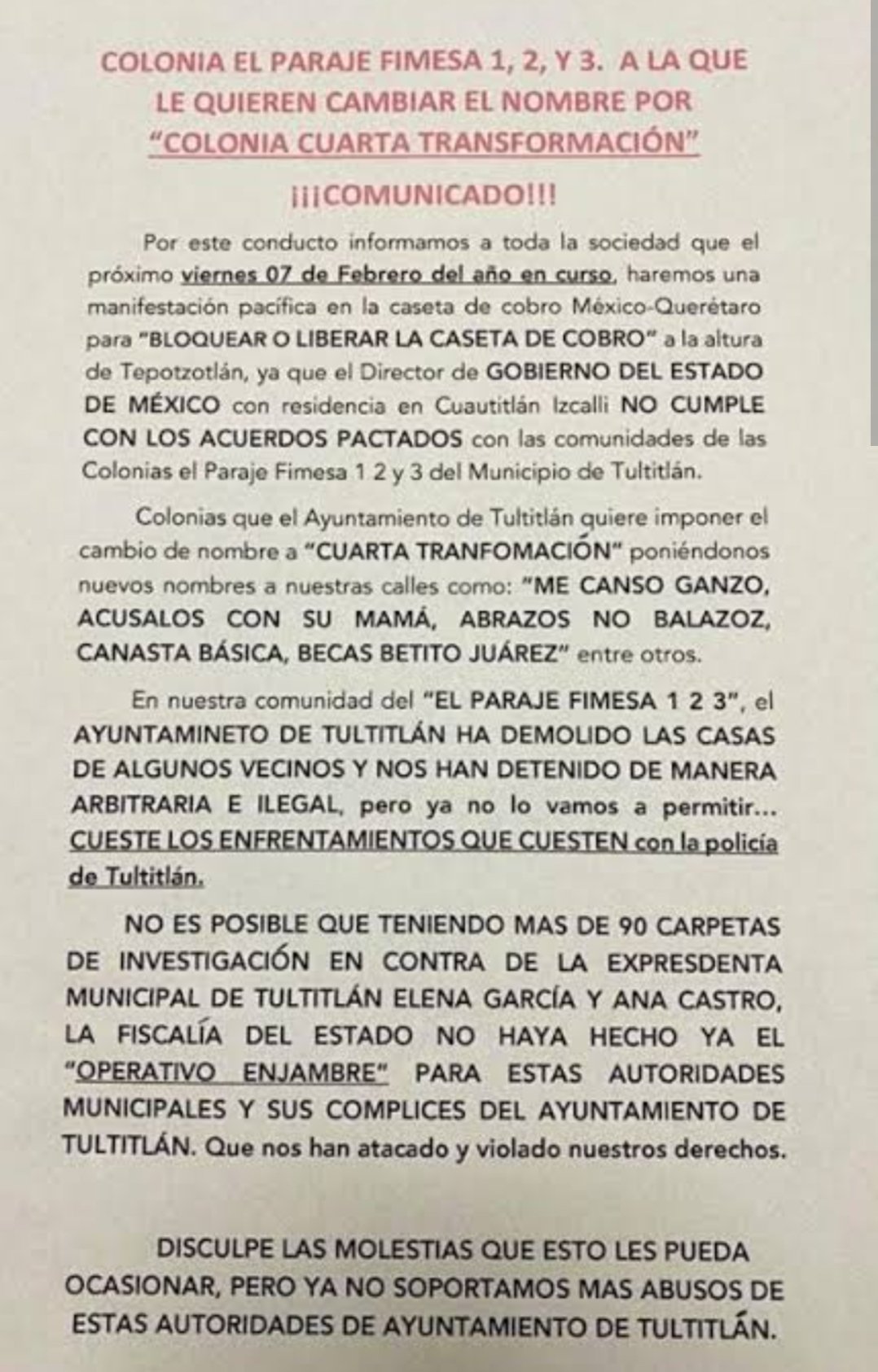 Vecinos de Tultitlán bloquean la México-Querétaro; rechazan la colonia Cuarta Transformación - anuncio-de-bloqueo-de-la-mexico-queretaro-655x1024